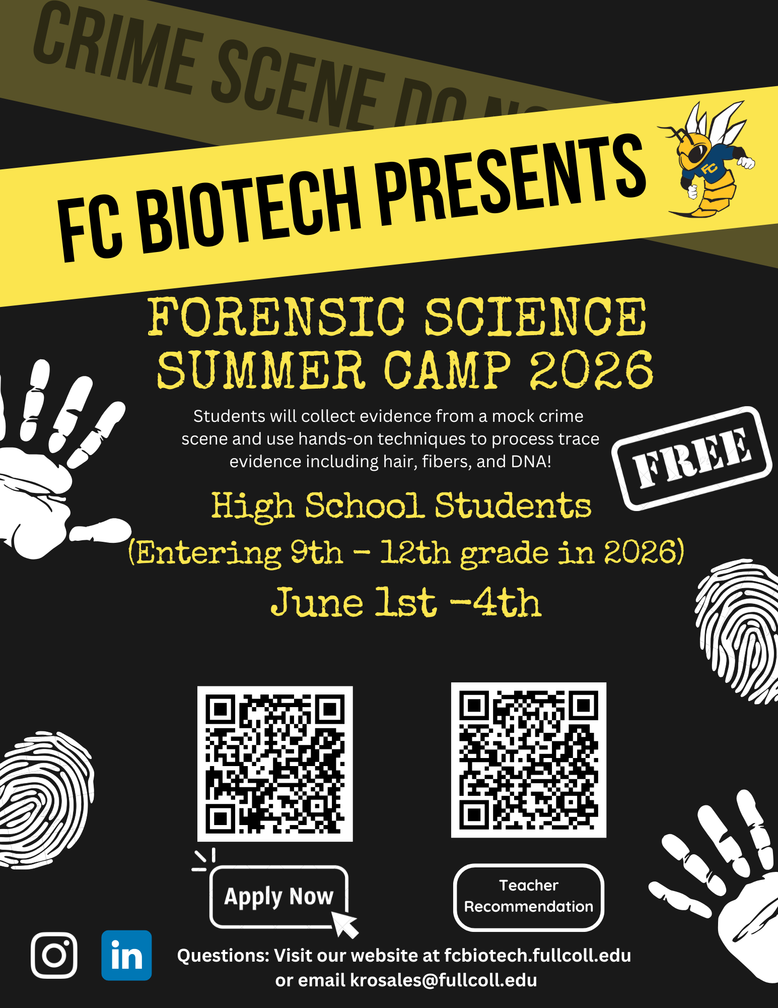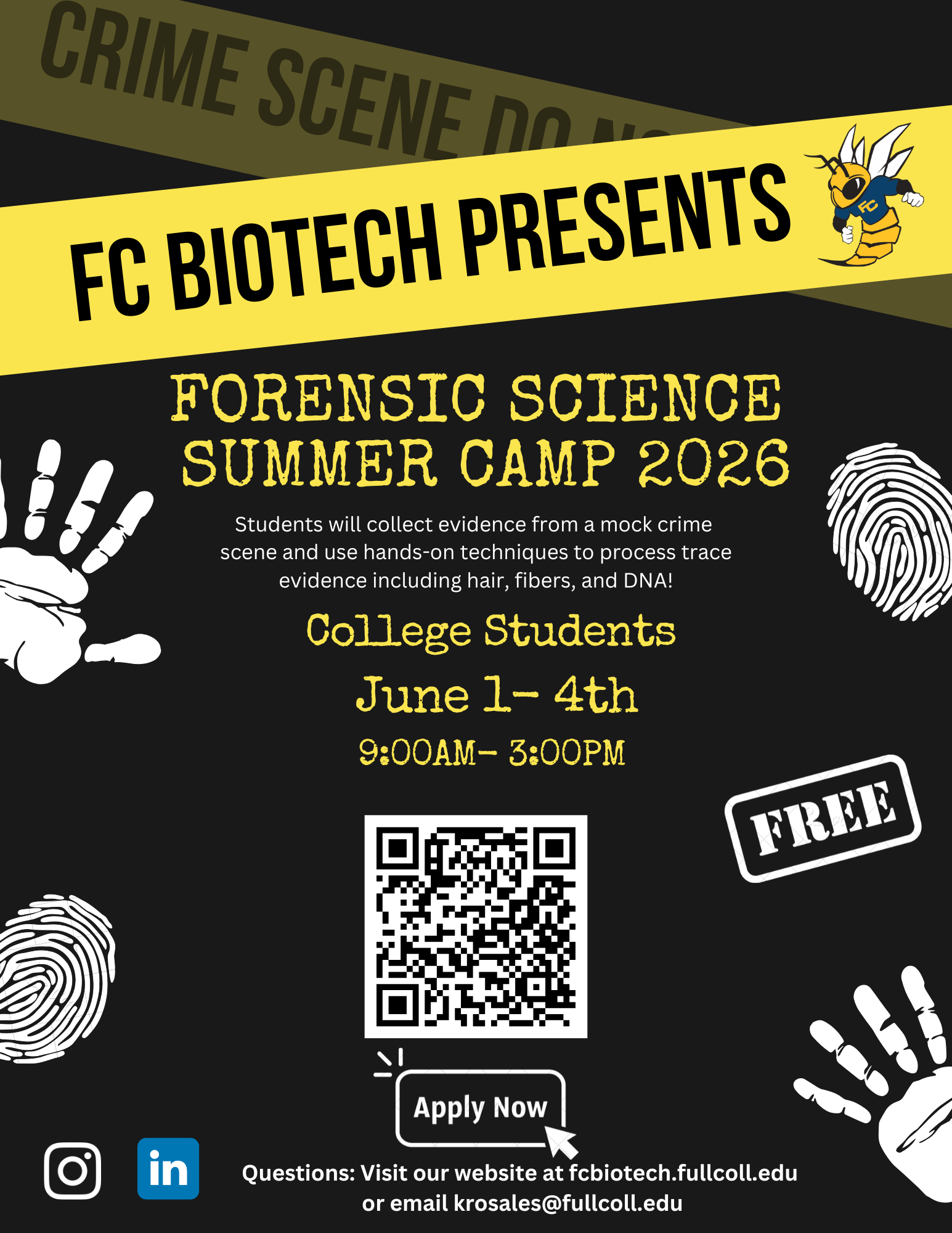 Students participating in this free camp will collect evidence from a mock crime scene and use hands-on techniques to process trace evidence including hair, fibers, and DNA!
